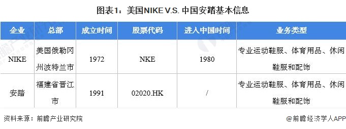 NIKE是美国运动鞋龙头企业,而安踏是中国运动鞋龙头企业。NIKE成立于1972年,其前身是NIKE总裁菲尔·奈特以及比尔·鲍尔曼教练投资的蓝带体育公司。成立当年,奈特和鲍尔曼发明出一种鞋,并依照希腊胜利之神的名字将其命名为NIKE。经过五十年的发展,NIKE已经成为全球最大的运动品牌,经营范围包括运动鞋、运动服饰、体育用品等。