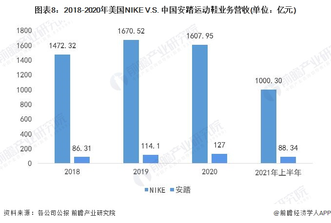 在营收方面,2021财年上半年,NIKE的运动鞋业务营收约为1697.05亿元,总营收约为2454.05亿元;安踏运动鞋业务营收为127亿元,总营收为355.12亿元。