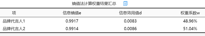 使用熵值法对品牌代言人1等总共2项进行权重计算,从上表可以看出:品牌代言人1, 品牌代言人2总共2项,它们的权重值分别是0.490, 0.510。并且各项间的权重相对较为均匀,均在0.500附近。