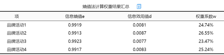使用熵值法对品牌活动1等总共4项进行权重计算,从上表可以看出:品牌活动1, 品牌活动2, 品牌活动3, 品牌活动4总共4项,它们的权重值分别是0.247, 0.266, 0.235, 0.252。并且各项间的权重相对较为均匀,均在0.250附近。