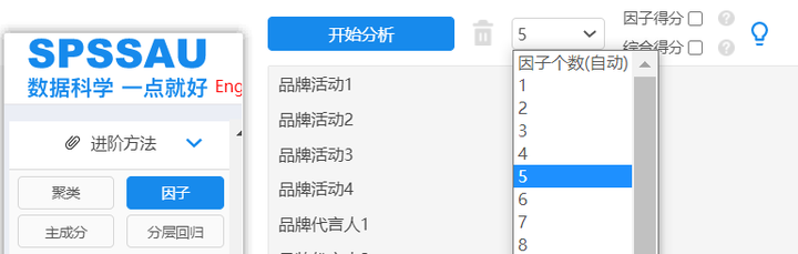 因为案例的预设维度为5所以将分析项拖拽到右侧分析框后,下拉选择因子个数为5。此次案例利用因子分析计算权重,所以不需要勾选“因子分析”与“综合得分”。