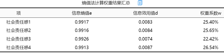 使用熵值法对社会责任感1等总共4项进行权重计算,从上表可以看出:社会责任感1, 社会责任感2, 社会责任感3, 社会责任感4总共4项,它们的权重值分别是0.254, 0.256, 0.224, 0.265。并且各项间的权重相对较为均匀,均在0.250附近。