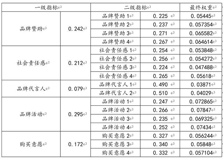 综上所述可以得到品牌赞助、社会责任感、品牌代言人、品牌活动以及购买意愿的权重分别为0.242、0.212、0.079、0.295以及0.172。将一级指标二级指标整理如下并计算相应的最终权重。