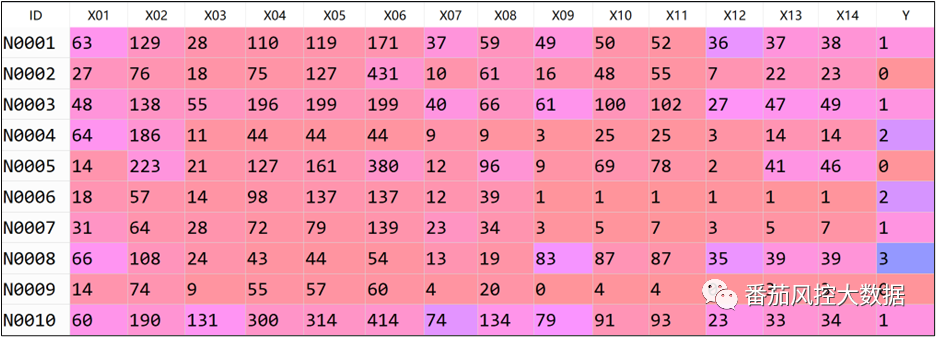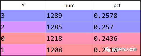 通过上文介绍,我们大体熟悉了LDA的算法流程与应用特点,以及在具体的实现方法,为了说明LDA针对特征降维过程的输出效果,接下来我们围绕具体的实例数据,采用LDA来完成样本数据的特征降维。本文选取的样本数据包含5000条样本与16个特征字段,部分样例如图2所示,其中ID为样本主键,X01~X14为特征变量,取值类型为数值型;Y为目标变量,取值分别为0、1、2、3,具体分布如图3所示。