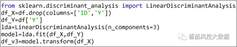 根据以上数据样例可知,样本包含目标变量Y,满足LDA特征降维的有监督前提条件。由于变量Y的取值类别数为4,则采用LDA实现的特征降维数量最多为3,具体特征降维过程如图4所示,输出的特征数据df_v3结果样例如图5所示。