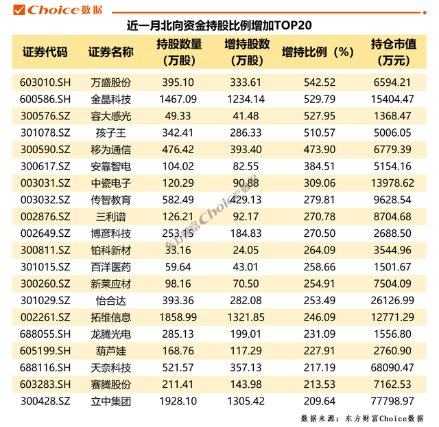 近一月,北向资金对60只个股的增持比例超过一倍。增持比例最大的是万盛股份,持仓股数从61.49万股增加至395.10万股,净增持333.61万股,增持比例542.52%。