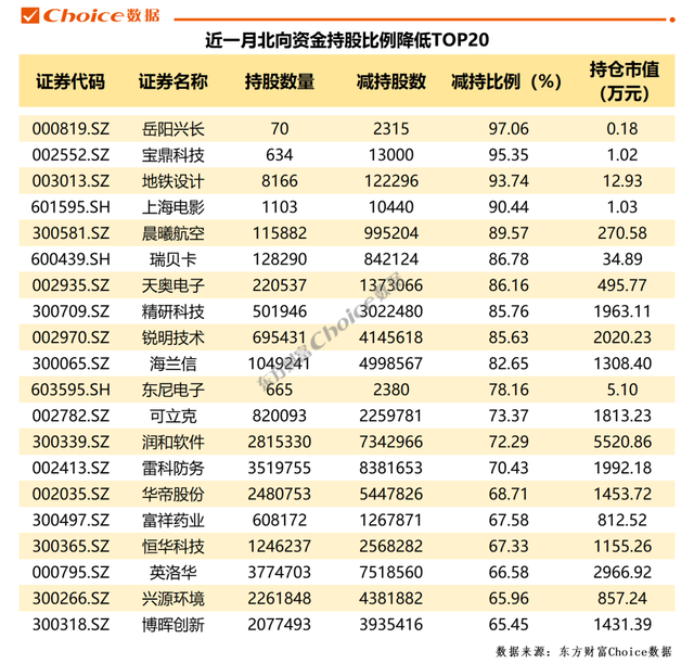 近一月,北向资金减持比例前三的个股分别是岳阳兴长、宝鼎科技和地铁设计,减持比例超过93%;减持后,北向资金持有岳阳兴长仅剩70股。