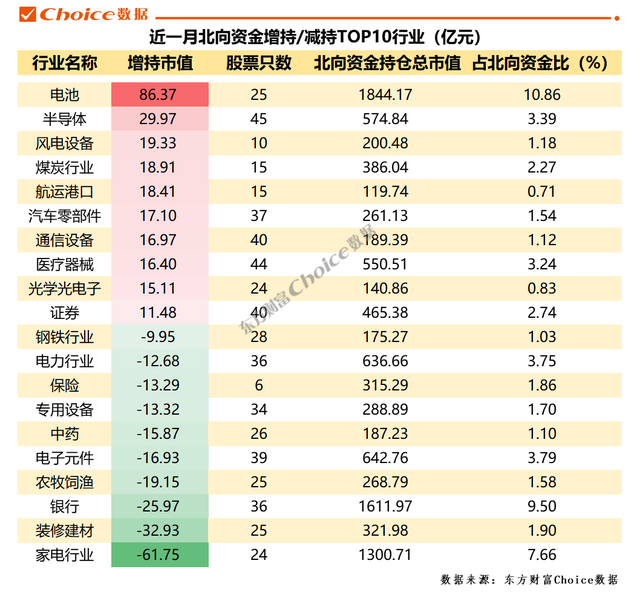 近一月,北向资金持仓调整明显,大幅加仓电池、风电等高景气度行业。