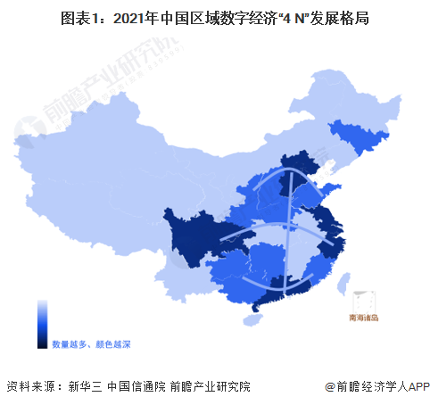 中国数字经济呈现明显区域特征,各区域、各城市数字经济发展依托本地创新、产业、区位、政策等优势,形成了各具特色的数字经济发展现状。根据《中国城市数字经济指数蓝皮书》数据,原有粤港澳大湾区、京津冀、长三角、成渝城市群数字经济发展水平保持领先,城市群逐步辐射周边区域,总体形成了“4+N”的区域格局。本文以北京、上海、广东、四川为样例,分析四个代表性省市数字经济发展情况。