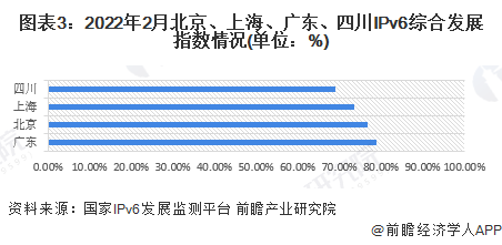 互联网协议第六版(Ipv6)是互联网升级演进的必然趋势,是中国建设网络强国的重要支撑。根据国家IPv6发展监测平台数据,截至2022年2月,四个省市Ipv6综合发展指数均处于较高水平,其中广东IPv6综合发展指数达到78.90%,排名第一,表明广东网络基础设施、应用基础设施等水平较高。