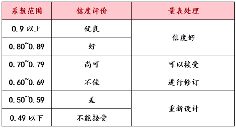 对搜集的样本进行信度分析,SPSSAU提供四种信度系数计算,每种方法的适用情况不同,最常用的是Cronbach α信度系数。信度系数评价如下: