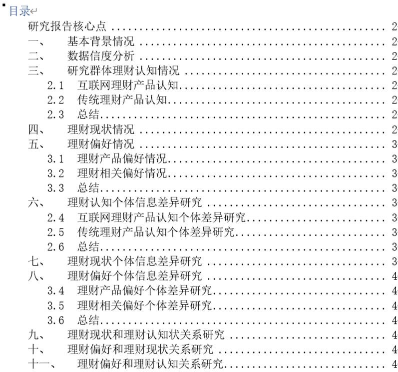 当背景信息与关键词交叉分析后,可以进行关键词与关键词交叉分析,比如“理财现状和理财认知关系研究”、“理财偏好和理财现状关系研究”以及“理财偏好和理财认知关系研究”。在报告的整体框架搭建完成后,还需要进行一些优化工作,比如加入‘前言’,或者‘总结等’。