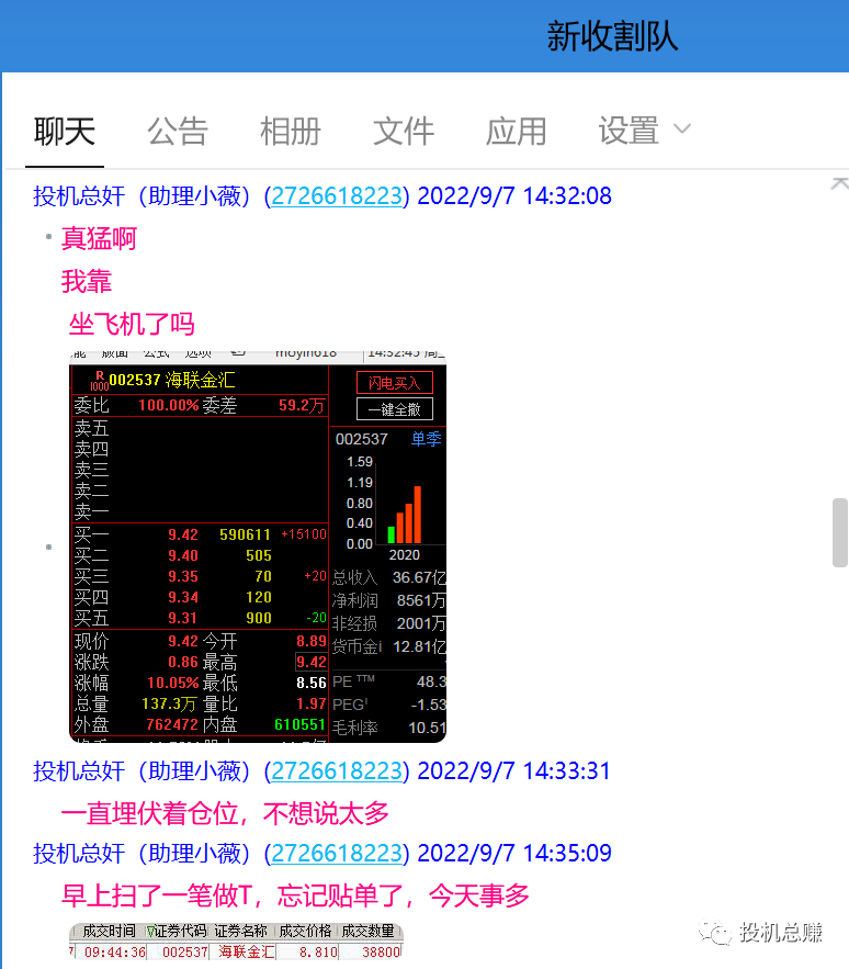 每次感受着群里队员的喜悦,总赚在替他们高兴之余,也有一丝丝哀愁,因为那些在荆棘满途中走散的兄弟,仍是我心头一道隐隐作痛的伤口。不知道他们现在是否还安好,是否还是在股市里被虐得遍体鳞伤,是否有变得更坚强,无论如何,我祝福他们,诚心诚意地为他们祈福,同时我也非常希望你们回来,以前收割队的模式比较激进,更多的是盘中出击,所以经常有赚有亏,现在经过千锤百炼的研究,技术低吸模式已经非常成熟,可以说除了极端走势的股zai失灵,其余时间都能做到稳定盈利。