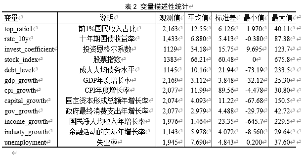 本文的被解释变量是一国排名前1%国民的收入占全体国民收入的比重(top_ratio1),用以衡量一国贫富差距的变化情况。当该比重增加时,说明较少的国民占据了更多的财富,则一国的贫富差距将进一步扩大,反之,则说明该国的贫富差距有所缓解。
