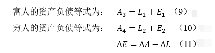 其中,A3代表富人的总资产,L1为其负债,E1为其资产净值;A4代表穷人的总资产,L2为其负债,E2为其资产净值。ΔE、ΔA、ΔL分别为净资产变动量、总资产变动量、负债变动量。