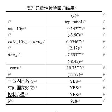 表7报告了利率走势对不同经济体贫富差距影响程度的异质性检验结果,列(1)结果显示,十年期国债利率(rate_10y)的系数显著为负,十年期国债与是否为发达经济体的交乘项(rate_10Yit×DEVit)系数显著为正,说明利率走势降低对贫富差距的扩大作用在发展中国家表现更强。原因可能是相比于发达经济体来说,发展中国家存在金融抑制问题,很多民营企业与个人无法获得金融支持,导致其持有的金融资产比例较低,因此利率走势的降低导致的贫富差距扩大现象更加严重,证明了假说二的部分内容。
