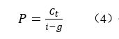 根据资产定价理论,金融资产价格与利率的变动息息相关,我们以式(4)模型来描述无风险利率与资产定价之间的相关关系。其中,P为金融资产的价格,Ct为资产在t时刻产生的现金流,即股息或债券利息收入,i为利率,g为企业增长率每期递增比率。