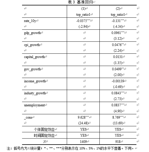 本文采用面板回归方法,并控制住时间效应和个体效应。表3报告了利率水平对贫富差距作用的检验结果。列(1)未加入控制变量,回归结果显示,十年期国债收益率对排名前1%国民收入占全体国民收入比重的作用效应在1%的水平下显著为负,系数为-0---------.0375。结果初步表明,利率水平与贫富差距扩大之间为负向效应,即利率水平的下降,会导致排名前1%国民收入占全体国民收入比重提高,更多的财富掌握在少数人手中,贫富差距进一步扩大;列(2)加入了控制变量,回归结果与列(1)相似,十年期国债收益率对排名前1%国民收入占全体国民收入比重的作用效应在1%的水平下仍显著为负,系数为-0.131。 对比可知,无论是否加入控制变量,利率水平的下降对贫富差距的扩大均有显著促进作用。由此验证假说1,利率下降会导致贫富差距的扩大。
