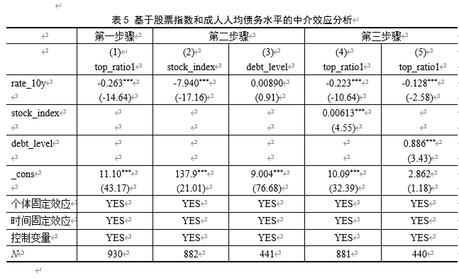 根据理论分析,利率降低会提升股票、权益类金融资产的价格,但是并不能缓解居民的债务偿还压力。为了检验利率变动在资产端和负债端的非对称影响对贫富差距扩大的作用机制,本文选用各国的股票指数(stock_index)作为资产端的中介变量,选取成人人均负债(debt_level)作为负债端的中介变量。中介效应模型的构建步骤如下: