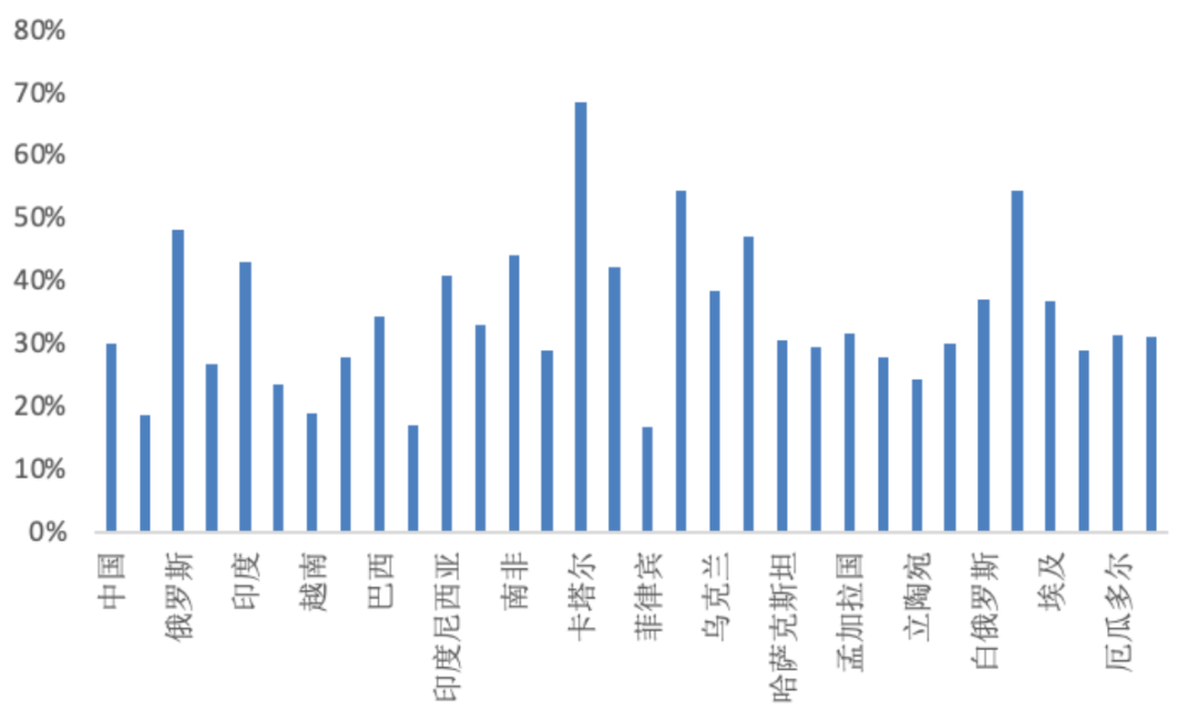 从产品切入考察2020年其他国家在上述产品的出口份额变化。我们保留了细分商品数据齐全且出口金额占比不低于0.1%的65个经济体,这些国家和地区的出口金额占全球的94%以上。我们先将其分成新兴市场经济体和发达经济体。如表2所示,疫情前5年(2014-2019年),新兴市场经济体在燃料和矿产品、初级电子数据处理和办公设备、纺织品和服装行业的出口份额较高,而发达经济体则占据了大部分制造业产品的出口份额。我们将这些商品在2020年的出口份额与疫情前平均水平进行比较,发现新兴市场经济体(不包括中国)和发达经济体对纺织品的出口份额大幅回落,同时发达经济体对部分制造业产品的出口份额也有所下降。图2 疫情前5年新兴市场经济体