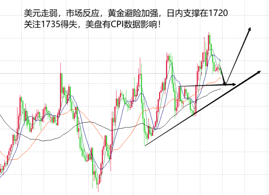 短周期黄金今日早上承压1727美金小幅回调,日内保持低多看涨思路,支撑在1720,美盘不破1735则看震荡,等待CPI数据公布。