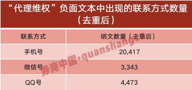 进一步分析这些所谓的“网络维权”文本,可以看到74%的文章都带有手机号、微信号、QQ号等联系方式,并且这些联系方式存在高度一致的情况。
