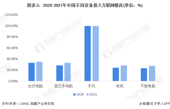 从不同设备接入互联网情况,截至2021年12月,其中我国网民使用手机上网的比例最高,达99.7%;使用台式电脑、笔记本电脑、电视和平板电脑上网的比例分别为35.0%、33.0%、28.1%和27.4%,各类设备接入互联网比重均有所提高。