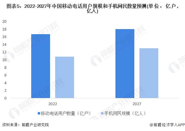 预计未来我国移动电话用户规模仍将持续缓步增长,而伴随着移动电话用户规模的增长,我国手机网民数量规模也将持续增长。预计2027年我国移动电话用户规模和手机网民数量将分别达到18亿户和13亿人左右。