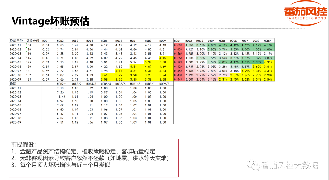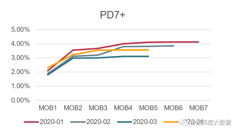 展示方法通常为:图表,上图即为PD7+的Vintage案例。通常来说,随着账龄的增加Vintage的曲线是单调递增的,但是增势逐渐下降。我们可以看出上图基本上在MOB4的时候趋于稳定。