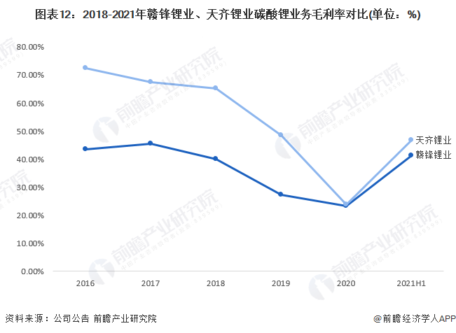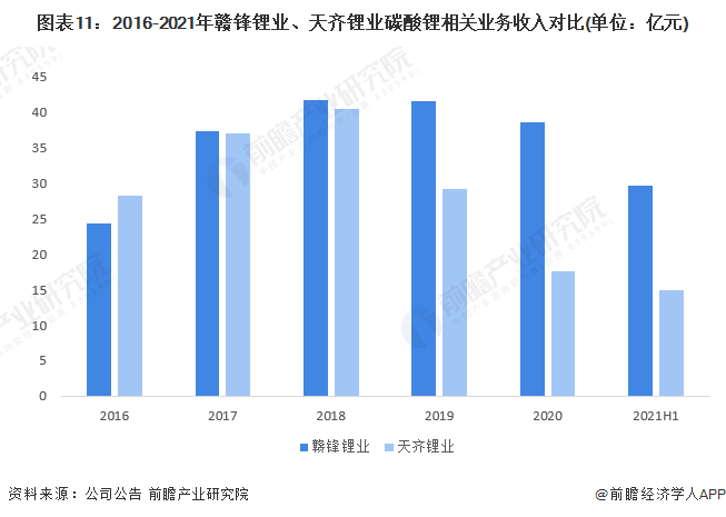 从碳酸锂业务的经营情况来看,2016年之后,赣锋锂业的碳酸锂业务收入超过天齐锂业,并且每年保持超越。2020年,赣锋锂业碳酸锂业务实现收入38.62亿元,天齐锂业的碳酸锂业务实现收入17.57亿元。2021年上半年,赣锋锂业碳酸锂业务实现收入29.61亿元,天齐锂业的碳酸锂业务实现收入14.87亿元。
