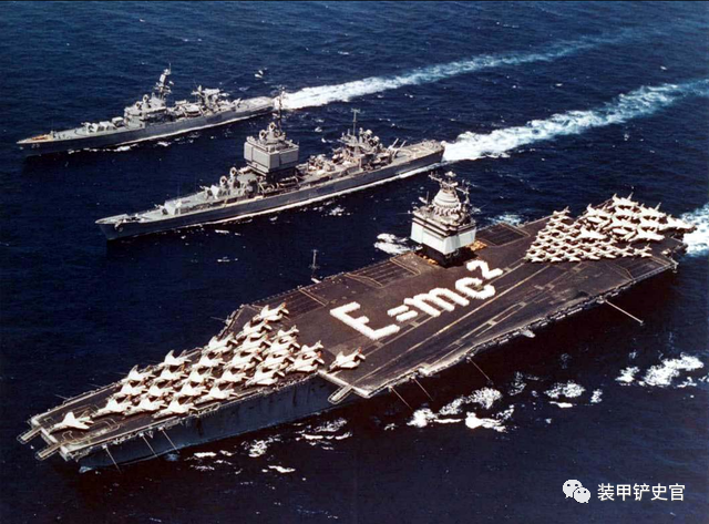 1964年7月到10月,“企业”号与核动力巡洋舰“长滩”号、核动力驱逐舰“安布里奇”号组成史上首支全核舰队,在全程不加注燃料的情况下完成环球航行,历时65天,航程48345千米,并在途中留下一张著名照片:舰员们在甲板上摆出质能方程E=mc2,这次远航充分证明了核动力舰艇的优势。