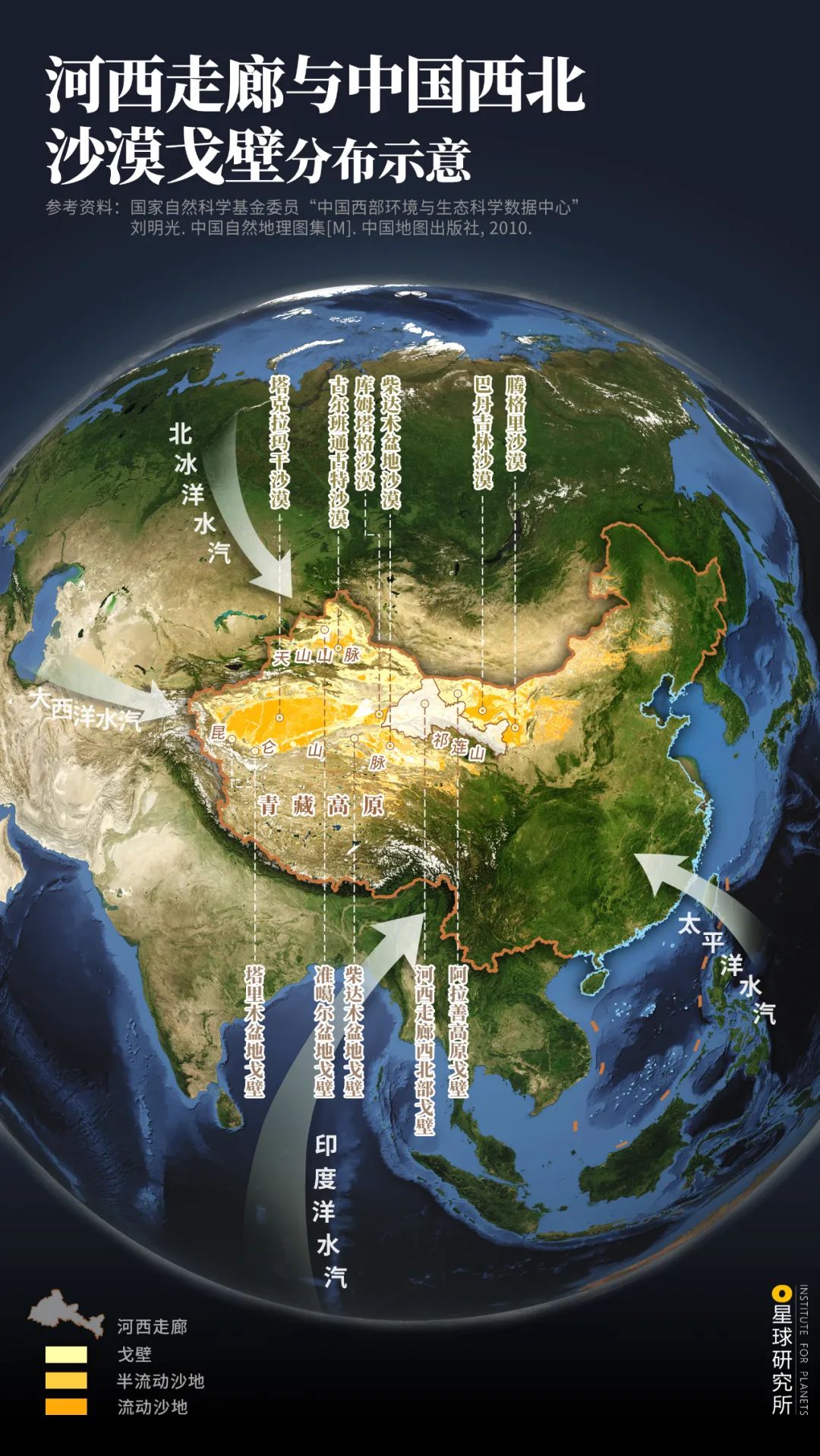(河西走廊与中国西北沙漠戈壁分布示意,制图@吴昕恬/星球研究所)