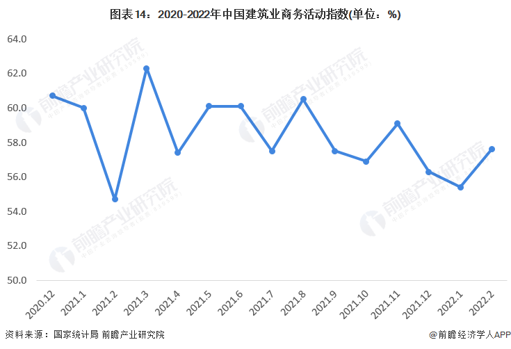 建筑业预期向好。2022年2月,建筑业商务活动指数为57.6%,比上月上升2.2个百分点,其中土木工程建筑业商务活动指数为58.6%,高于上月8.9个百分点,建筑业景气水平明显提升。从市场需求和预期看,新订单指数和业务活动预期指数分别为55.1%和66.0%,均高于上月,其中业务活动预期指数连续两个月运行在高位景气区间,表明受近期稳投资加快推进,部分重大基础设施工程和项目适度超前开展等因素带动,建筑业企业对行业发展预期向好。