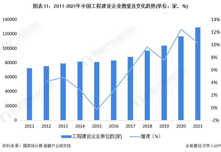 2011-2021年,中国工程建设企业数量整体呈现上升趋势。2020年,中国工程建设企业数量超过11万家,相比2019年增加了12%以上。2021年,中国工程建设企业数量保持高速增长,数量接近13万家。