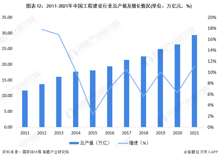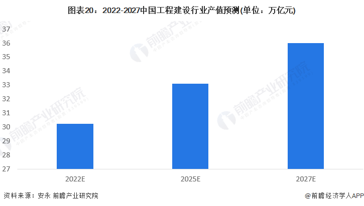 根据安永信息显示,“十四五”期间,中国工程建设市场将从中速增长期进入中低速发展期,但中国仍拥有全球最大的建设规模。2022年,中国工程建设行业市场规模在疫情好转后继续保持增长态势,工程建设行业总产值将突破30万亿大关。根据安永预测数据显示,2025年中国建筑行业总产值约为人民币33万亿元。2027年,中国建筑业总产值预计将突破36万亿元。