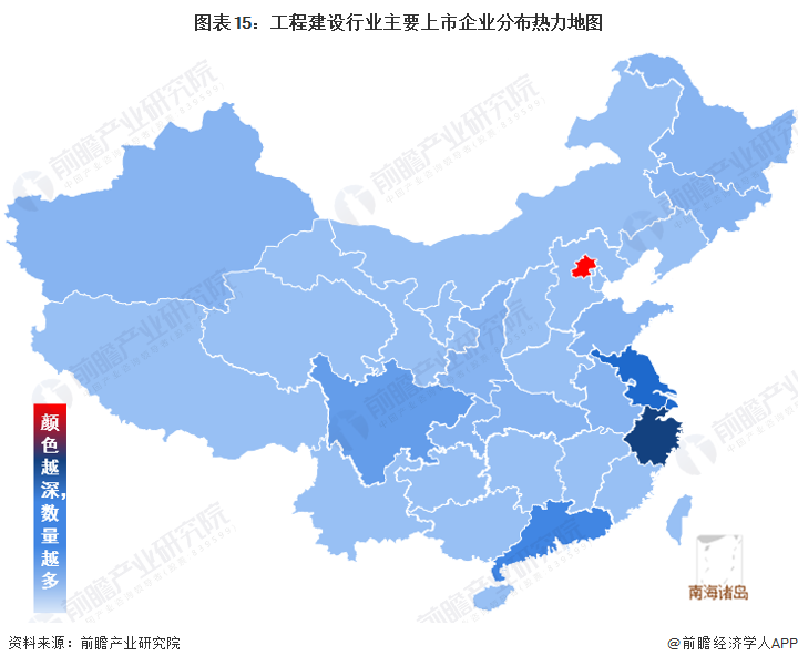 从中国工程建设行业主要上市企业区域分布状况来看,主要集中在华东、华南、华北为代表的中国东部地区,西部地区相对较少。主要分布省市为北京、浙江、江苏、上海、广东等地。西藏、海南、青海、宁夏、内蒙古等地企业数量相对较少。
