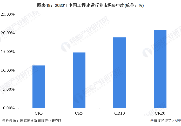 中国工程建设行业市场规模庞大,参与者众多,据国家统计局数据显示,2020年中国建筑业企业数量达到了116722家,且依旧处于上升趋势。从中国工程建设行业市场集中度来看,2020年中国工程建设行业CR3约为11%;CR5约为15%;CR10不到19%;CR20也刚超过20%。虽然行业内龙头企业林立,但行业整体集中度较低,这主要是由于工程建设行业市场庞大,随着中国经济乃至全球经济的不断发展,为工程建设行业企业提供了发展空间.