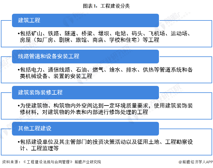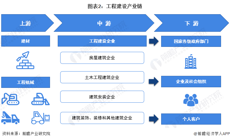 从中国工程建设产业链来看,上游主要为以水泥、涂料等为代表的建材企业和以挖掘机、起重机等为代表的工程机械企业;产业链中游为工程建设企业,主要分为房屋建筑企业、土木工程建筑企业、建筑安装企业、建筑装饰装修和其他建筑企业;下游为需求客户,主要客户全体为国家各级政府部门、企业及社会组织、个人客户等。