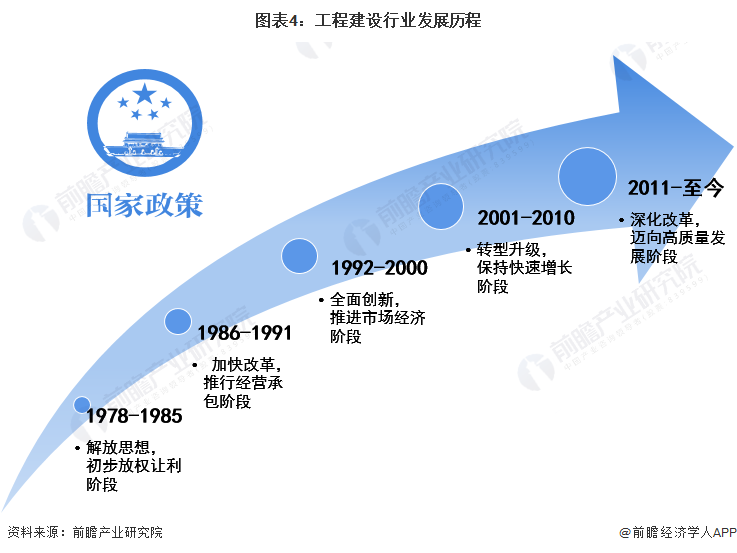 中国工程建设行业的发展自1978年起可以分为五大阶段,分别为“解放思想,初步放权让利阶段”、“加快改革,推行经营承包阶段”、“转型升级,保持快速增长阶段”、“转型升级,保持快速增长阶段”和“深化改革,迈向高质量发展阶段”。