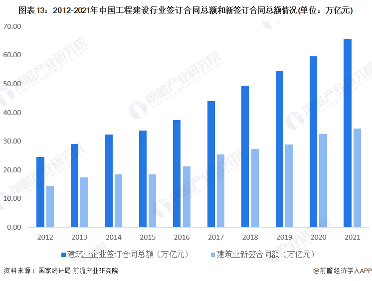 根据国家统计局数据显示,2012-2021年,中国工程建设行业签订合同额及新签合同额皆呈现上升趋势。2021年,全国工程建设行业企业签订合同总额65.69万亿元,同比增长10.29%,其中新签合同额34.46万亿元,同比增长5.96%。