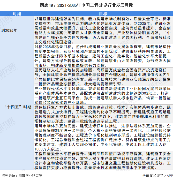 《“十四五”建筑业发展规划》根据《中华人民共和国国民经济和社会发展第十四个五年规划和2035年远景目标纲要》编制,主要阐明“十四五”时期建筑业发展的战略方向,明确发展目标和主要任务,是行业发展的指导性文件。其中指出到2035年,建筑业发展质量和效益大幅提升,建筑工业化全面实现,建筑品质显著提升,企业创新能力大幅提高,高素质人才队伍全面建立,产业整体优势明显增强,“中国建造”核心竞争力世界领先,迈入智能建造世界强国行列,全面服务社会主义现代化强国建设。