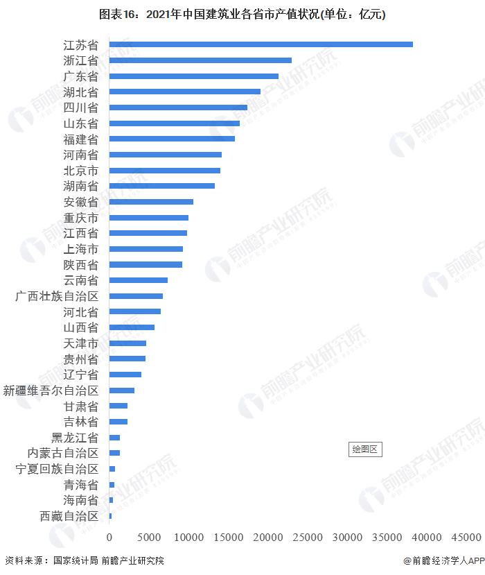 从各省市建筑业产值状况来看,2021年,江苏省以38244.49亿元的总产值排名第一,遥遥领先;其次为浙江省,建筑业总产值为23010.97亿元;广东省以21345.58亿元排名第三。排名前十的还有湖北、四川、山东、福建、河南、北京、湖南。