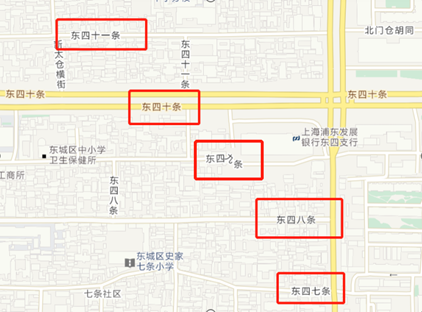 东四七条、东四八条、东四九条、东四十条、东四十一条。来源/天地图