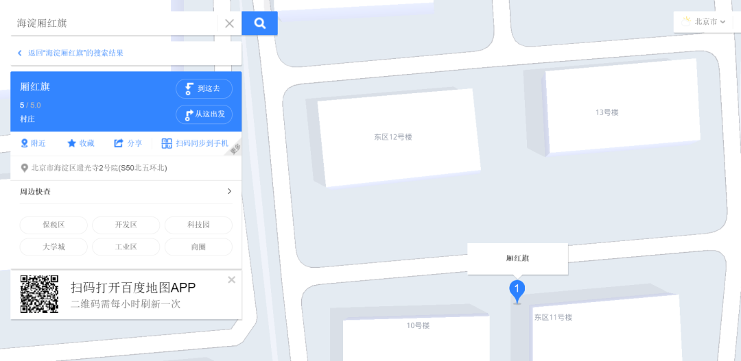 海淀区厢红旗。来源/百度地图北京地名中,也有一些“走心”的读法,例如“王五井儿”“西日门”“十大海”,初来乍到的新北京人,似乎有些不明白,其实这些地名用普通话的表述为王府井、西直门、什刹海。这些发音体现了北京话中的“吞音”现象。如果从文化角度看,也算走心地名。