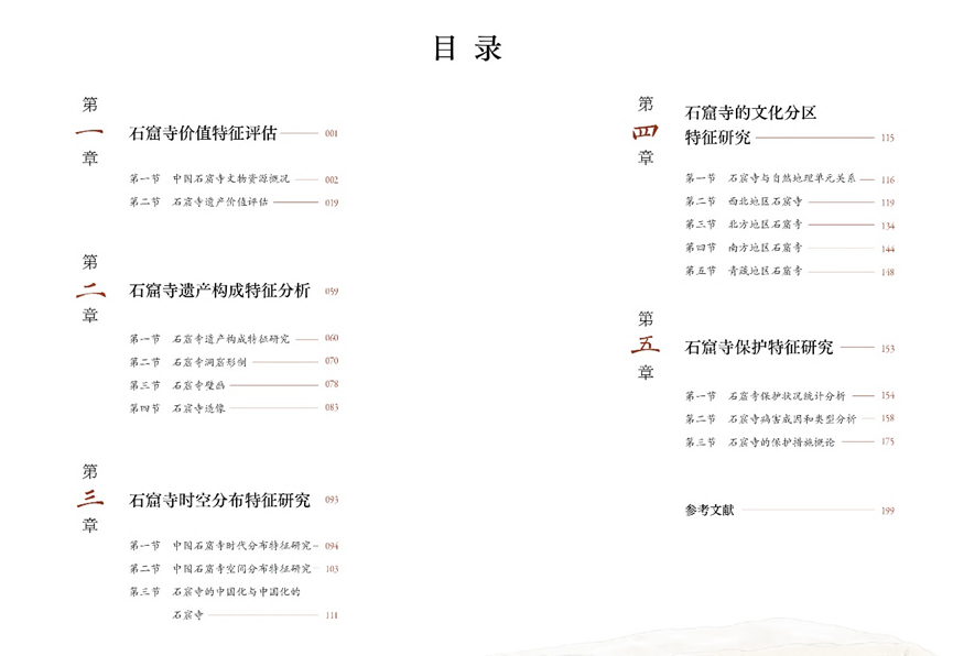 《中国石窟寺遗产特征研究》目录全书分为5章,作者对收集的数据和资料进行数理统计和分析,展现了石窟寺文物资源的规模与数量关系,研究了石窟寺在价值、时代和分布等方面的关联性、规律性,分析了石窟类文物病害及成因,总结了石窟寺保护方法和措施。