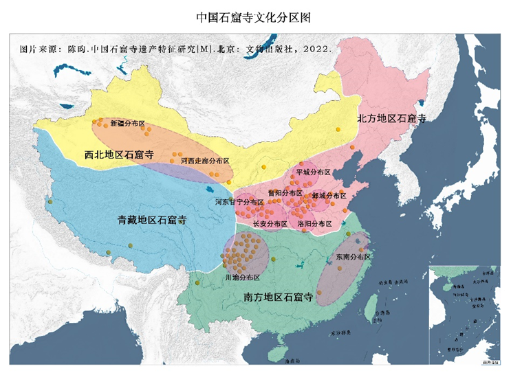 中国石窟寺文化分区图关于“石窟寺的中国化与中国化的石窟寺”的阐释时,《中国石窟寺遗产特征研究》第三章精辟的论述:石窟寺艺术传入中国后,其文化特质就附着在古老的东方思想文化体系之上,一开始就了启动了中国化的进程,经过优化选择、整合,在吸收中创新,在创新中发展,逐渐形成趋于一体化石窟寺的文化形态。受中国文化思想的改造与更新,石窟寺艺术的发展,表现为内容和形式的中国化、关注目标的世俗化、艺术方式的简捷化。在石窟寺中国化的基础上,发展形成具有中国文化内核和特质的石窟石刻表现新形式,即中国化石窟寺艺术新体系。