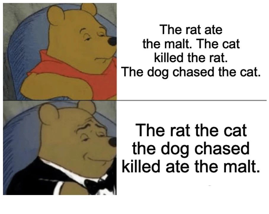 如果把后两句都揉进第一句,就会变成:狗追赶的那只猫杀死的老鼠吃了麦芽。