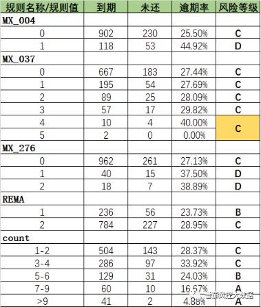 利用坏账把风险划分了5个等级之后,这样每个规则对应的规则值都会有一个风险等级的归类。