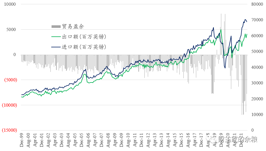 政府财政收上来的钱远远不够花,老是借钱借钱借钱,最后可不得印钞解决么?另一方面,自1999年以来,英国在进出口贸易方面,绝大部分时间都是贸易赤字,进口多,出口少,而且最近尤其严重。