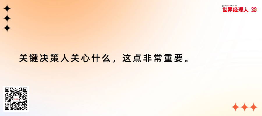 围绕着决策流程,认准关键决策人,在最短的时间里跟决策人建立信任关系,将自己变成关键决策人可以信任的合作伙伴。